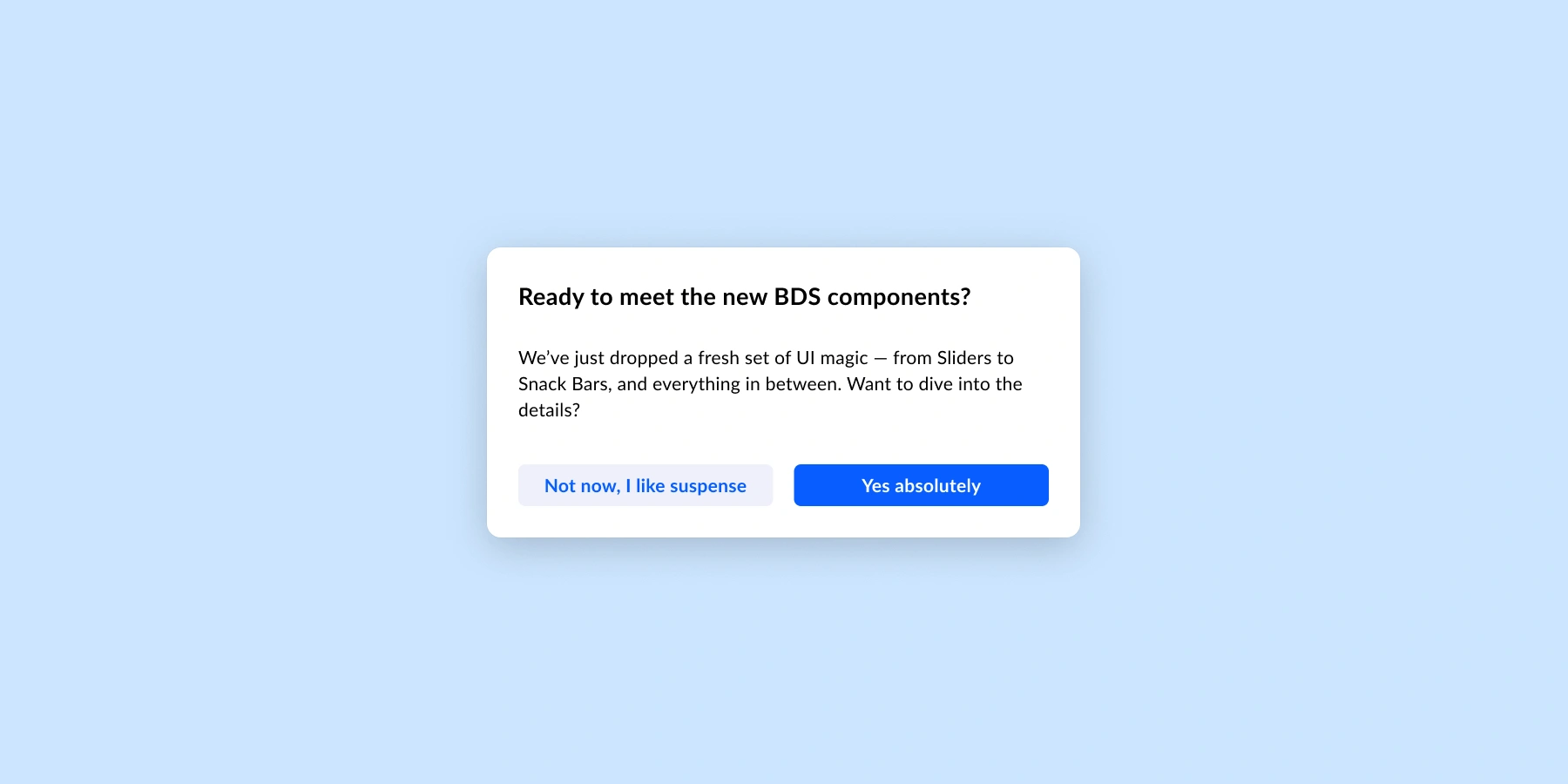 BDS Dialogs are modal windows built to deliver critical information or capture essential user decisions. We make it clear, accessible, and without distraction.