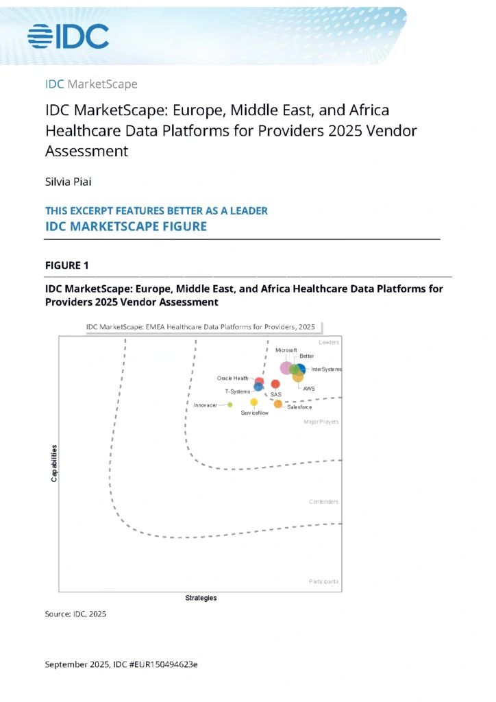 Laut dem Bericht sollten „Gesundheitsorganisationen in der EMEA-Region, die eine offene, zukunftssichere Datenarchitektur anstreben, welche die digitale Reife, Anwendungsagilität und Dateninteroperabilität unterstützt, Better in Betracht ziehen. Besonders geeignet ist die Lösung für Einrichtungen mit föderierten Datenstrategien, EHR-Modernisierungsinitiativen oder klinisch geleiteten Innovationsprogrammen, die Flexibilität gegenüber Anbieterbindung priorisieren.“