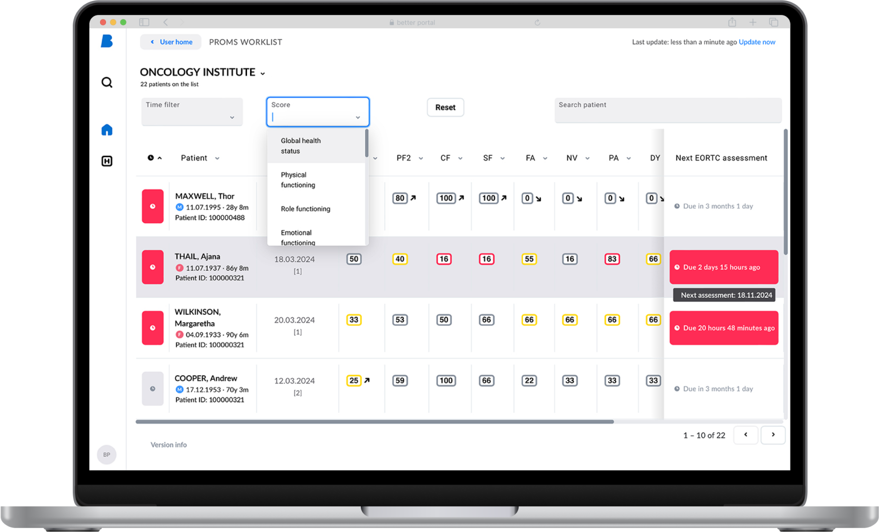 Capture, gestione y analice los resultados de salud y procesos reportados por los pacientes.